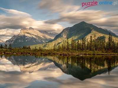Odbicie, Vermilion Lakes, Alberta, Jezioro, Kanada, Drzewa, Chmury, Góry, Las, Park Narodowy Banff