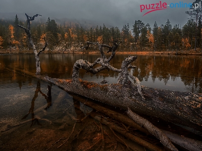 Jezioro, Drzewo, Konary, Powalone, Jesień, Drzewa, Suche