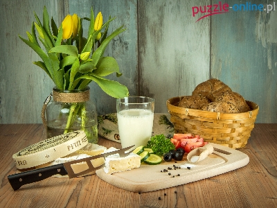 Warzywa, Tulipany, Kwiaty, Bułki, Ser, Śniadanie, Mleka, Żółte