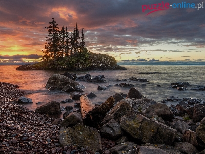 Wysepka, Jezioro górne, Zachód słońca, Cook, Stany Zjednoczone, Kamienie, Jezioro Lake Superior, Drzewa, Minnesota