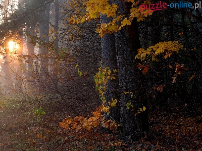 Liście, Las, Słoneczne, Jesień, Drzewa, Przebijające światło