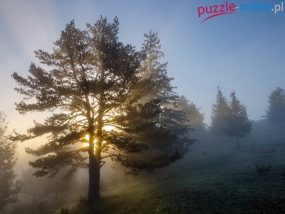 Puzzle Wschód słońca, Drzewa, Mgła, Poranek