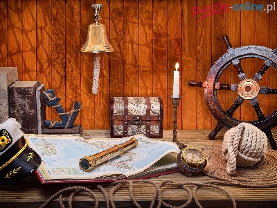 Atlas, Dzwonek, Świeczka, Lorneta, Kotwica, Deski, Szkatułka, Czapka marynarska, Ster, Książki, Świecznik, Sznur, Mapy, Kompas