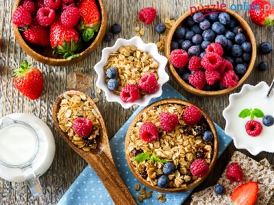Musli, Miseczki, Jagody, Owoce, Maliny, Åšniadanie, Truskawki, Mleko