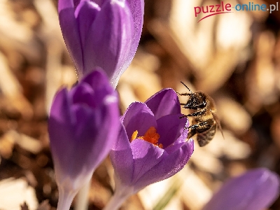 Puzzle Pszczoła, Fioletowe, Krokusy, Makro