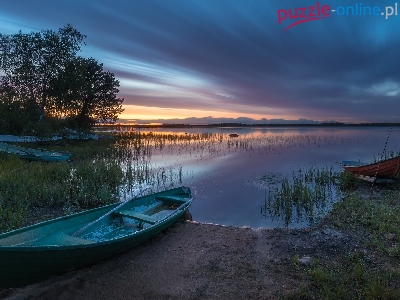 Jezioro, Drzewa, Zachód słońca, Chmury, Łódki