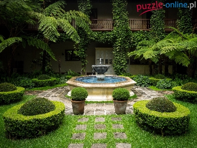Puzzle Drzewa, Fontanna, Dom, Klomby
