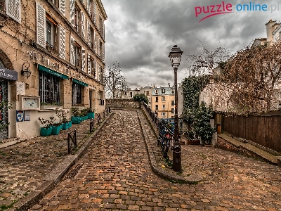 Bruk, Dzielnica Montmartre, Francja, Latarnia, Ulica, Domy, Paryż