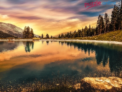 Góry, Kamień, Zachód słońca, Jezioro, Drzewa