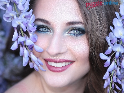 Szatynka, Kwiaty, Uśmiech, Makijaż, Kobieta, Twarz, Glicynia