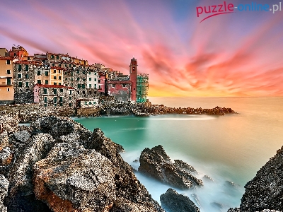 Wybrzeże, Włochy, Tellaro, Skały, Zachód słońca, Morze Liguryjskie, Domy, Liguria