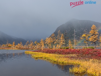 Jezioro Jack London, Drzewa, Rośliny, Tęcza, Rosja, Jesień, Obwód magadański, Kolorowe, Mgła, Góry Kołymskie, Trawy