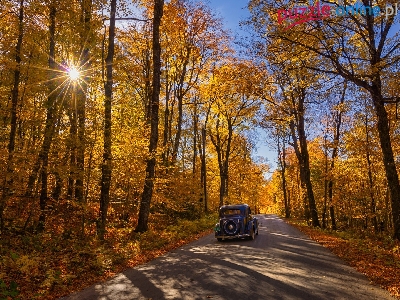 Promienie słońca, Droga, Jesień, Las, Drzewa, Samochód zabytkowy