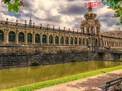 Budynek, Zwinger, Niemcy, Rzeka, Ławki, Drezno, Zabytek, Langgalerie z Bramą Koronną, Dwie