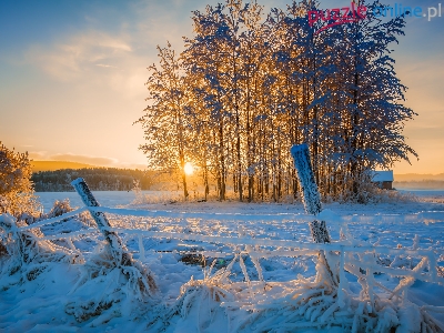 Dom, Pole, Wschód słońca, Zima, Drzewa, Ogrodzenie