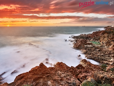 Puzzle Zachód słońca, Wybrzeże, Skały, Morze