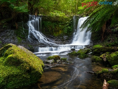 Rzeka, Omszałe, Stan Tasmania, Skała, Australia, Paprocie, Las, Wodospad Horseshoe Falls, Kamienie, Park Narodowy Mount Field