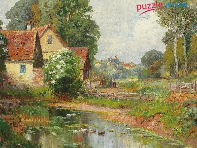 Kaczki, Malarstwo, Drzewa, Alois Arnegger, Krzewy, Wiosna, Staw, Obraz, Wieś, Dom