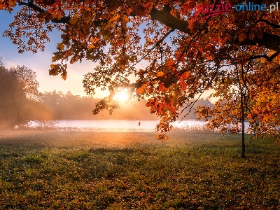 Dąb, Liście, Mgła, Drzewo, Rosja, Wschód słońca, Petersburg, Staw, Jesień, Kolorowe, Carskie Sioło