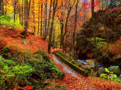 Las, Liście, Drzewa, Rzeka, Mostek, Jesień, Skały, Roślinność