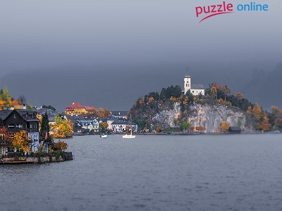 Jesień, Skała, Austria, Jezioro Traunsee, Kościół w Traunkirchen, Domy