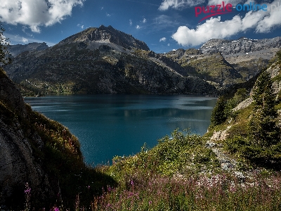 Jezioro Lac dEmosson, Chmury, Szwajcaria, Trawa, Góry Alpy, Świerki, Kanton Valais