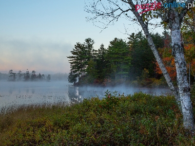 Drzewa, Las, Mgła, Rośliny, Niebo, Jezioro, Jesień, Brzoza, Poranek