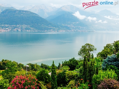 Drzewa, Jezioro Como, Włochy, Kwiaty, Góry, Ogród, Lombardia