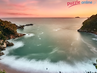 Zatoka, Zachód słońca, Morze, Skały, Roślinność