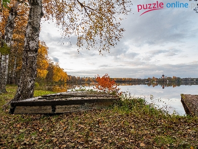 Las, Jezioro, Brzozy, Jesień, Łódka, Drzewa