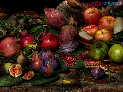 Figi, Jabłka, Kompozycja, Owoce, Granaty, Liście