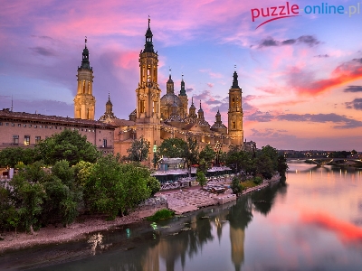 Bazylika katedralna Matki Bożej na Kolumnie, Aragonia, Zachód słońca, Saragossa, Chmury, Most, Drzewa, Hiszpania, Rzeka Ebro, Bazylika Nuestra Senora del Pilar