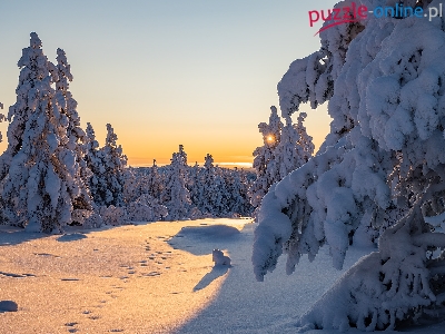 Drzewa, Wschód słońca, Zima, Ośnieżone, Świerki