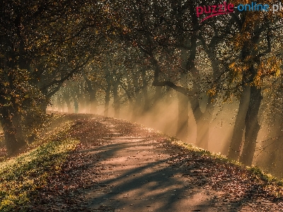 Poranek, Zakręt, Przebijające światło, Droga, Drzewa, Mgła