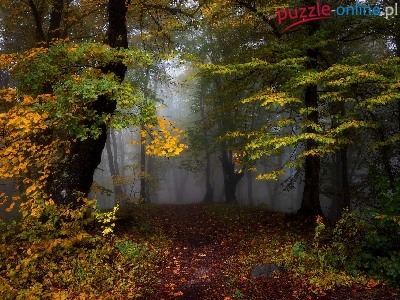 Drzewa, Las, Liście, Jesień, Mgła, Pożółkłe