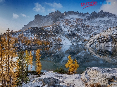 Drzewa, Śnieg, Odbicie, Skały, Stany Zjednoczone, Jezioro Leprechaun Lake, Zima, Góry, Stan Waszyngton