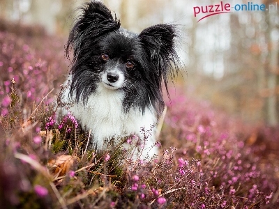 Puzzle Mordka, Pies, Spaniel kontynentalny miniaturowy Papillon, Wrzosy