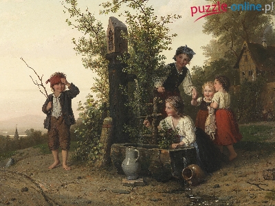 Malarstwo, Dzbany, Zabawa, Johann Georg Meyer, Dzieci, Obraz, WieÅ›, Studnia