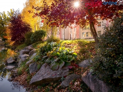 Rzeczka, Rośliny, Promienie słońca, Drzewa, Park, Kamienie, Budynek
