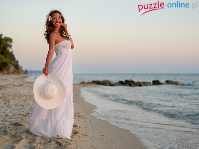 Kapelusz, Morze, Uśmiech, Sukienka, Kobieta, Biała, Piasek
