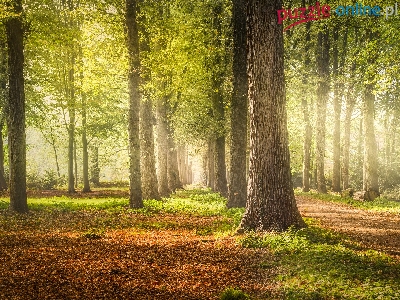 Zielone, Drzewa, Przebijające światło, Las, Ścieżka, Drzewa