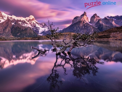Drzewa, Góry Cordillera del Paine, Patagonia, Jezioro Pehoe, Chile, Zanurzone, Konary, Park Narodowy Torres del Paine, Masyw Torres del Paine, Wschód słońca