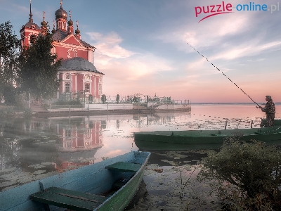 Łódki, Rybak, Monster Goricki Zaśnięcia Matki Bożej, Peresław Zaleski, Rosja, Cerkiew, Rzeka Trubezh River, Poranek, Obwód jarosławski