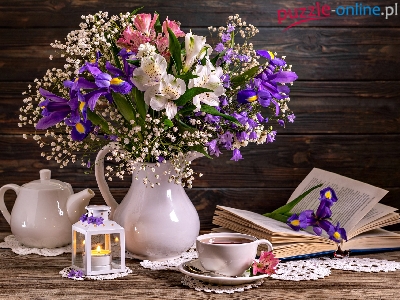 Bukiet, Książka, Kompozycja, Lampion, Kwiaty, Dzbanek, Filiżanka