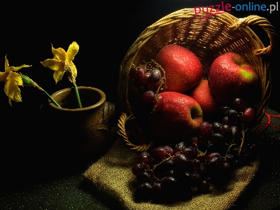 Koszyk, Narcyzy żonkile, Materiał, Owoce, Jabłka, Kompozycja, Winogrona, Wazon