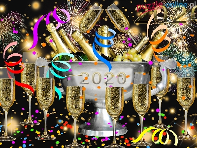 Noc, 2020, Winogron, 2D, Nowy Rok, Alkohol, Kiliszki, Data, Fajerwerki, Owoce, Puchar, Butelki, Sylwester, Konfetii, Szampan