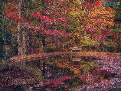 Opadłe, Park, Ławka, Jesień, Staw, Liście