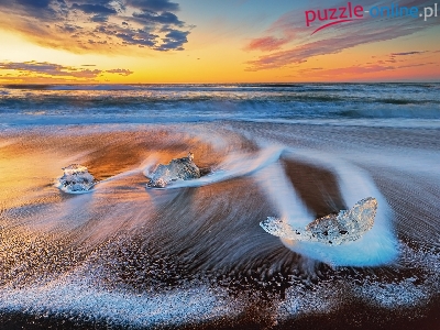 Puzzle Kamienie, Morze, Fale, Zachód słońca