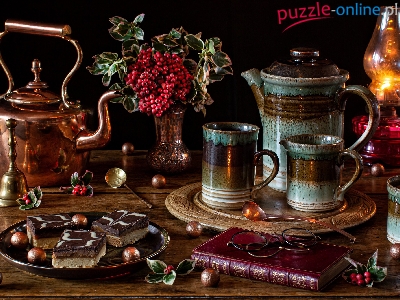 Lampa, Książka, Kubki, Kubki, Czajnik, Kompozycja, Jarzębina, Okulary, Dzbanek, Ciasto, Wazon