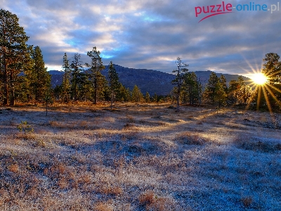Świt, Drzewa, Polana, Łąka, Trawa, Chmury, Promienie słońca, Szron, Niebo, Góry